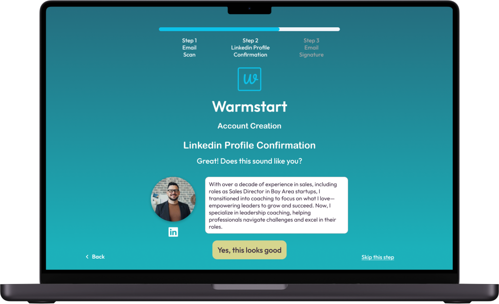 The purpose of linking a user’s LinkedIn profile to their account was to enable the Warmstart platform to quickly generate a biography for the user’s profile. In a future version of the product (MVP 2.0), the goal is to fully integrate the LinkedIn profiles of the user’s contacts.
