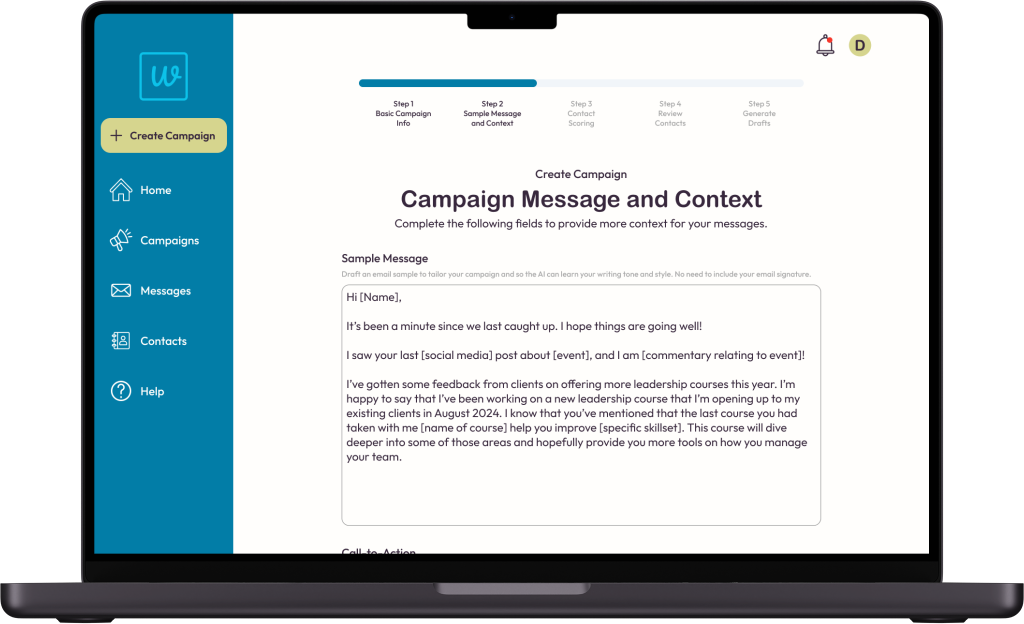 ✉️ **We've significantly revised our email campaign feature by eliminating the selection of campaign types and email templates. We found that these options were only complicating the process. Our AI technology aims to simplify user experience by minimizing complexity. To achieve this, users now provide a general sample message reflecting their desired tone. The AI learns from this initial input and any subsequent edits users make directly in Gmail drafts.